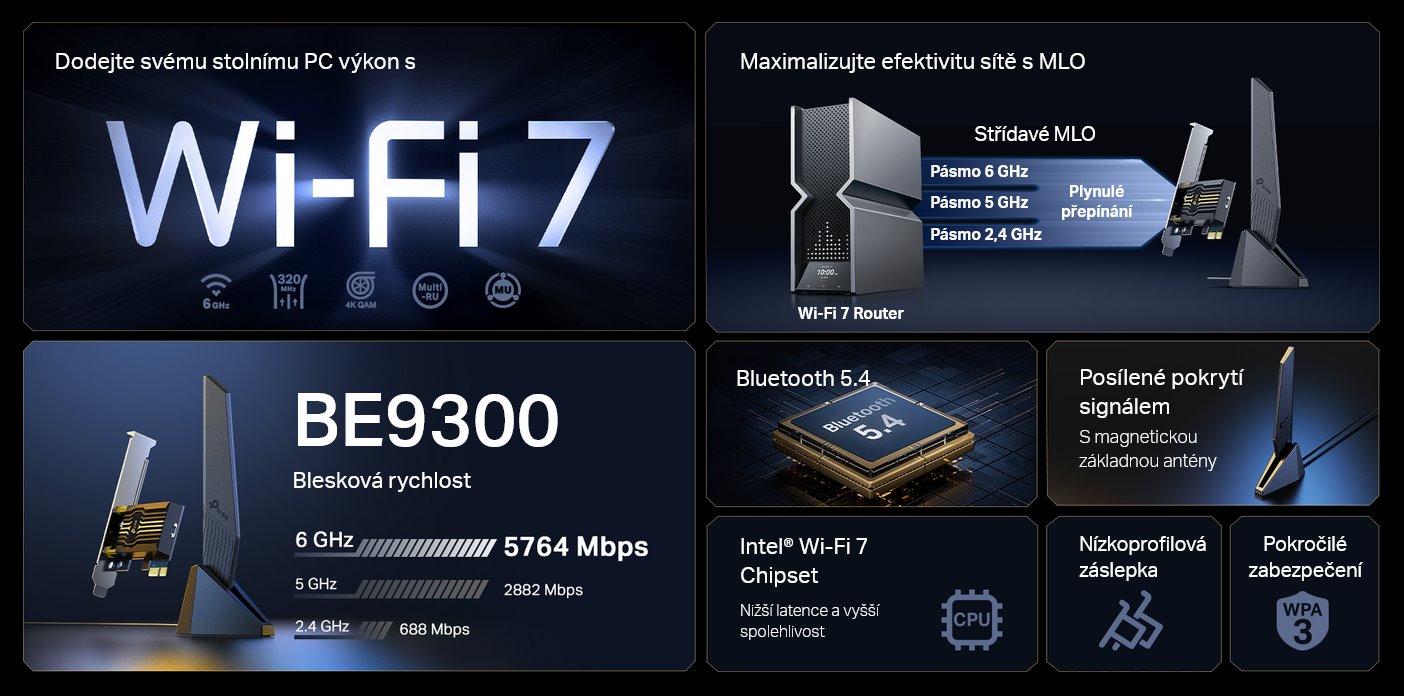 Srdcem řešení je čipová sada Intel® Wi-Fi 7, která výrazně snižuje latenci a zvyšuje spolehlivost připojení. Díky tomu naplno využijete možnosti Wi-Fi 7 routerů a získáte plynulý provoz i v náročných aplikacích v reálném čase. O bezpečnost se stará pokročilé šifrování WPA3, které chrání vaše osobní data a přihlašovací údaje před moderními hrozbami.