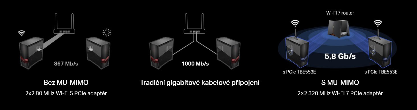 Odemkněte plný potenciál moderní bezdrátové sítě díky třípásmové Wi-Fi 7, která přináší rychlosti 5765 Mb/s (6 GHz), 2882 Mb/s (5 GHz) a 688 Mb/s (2,4 GHz). Čisté a široké pásmo 6 GHz nabízí maximální propustnost bez rušení, ideální pro hraní her, streamování ve vysokém rozlišení i práci s velkými daty. Nejnovější standard Wi-Fi 7 zajišťuje vyšší efektivitu, nižší odezvu a stabilní výkon i při vysokém zatížení sítě, zatímco zpětná kompatibilita umožňuje bezproblémové použití se staršími routery a zařízeními.