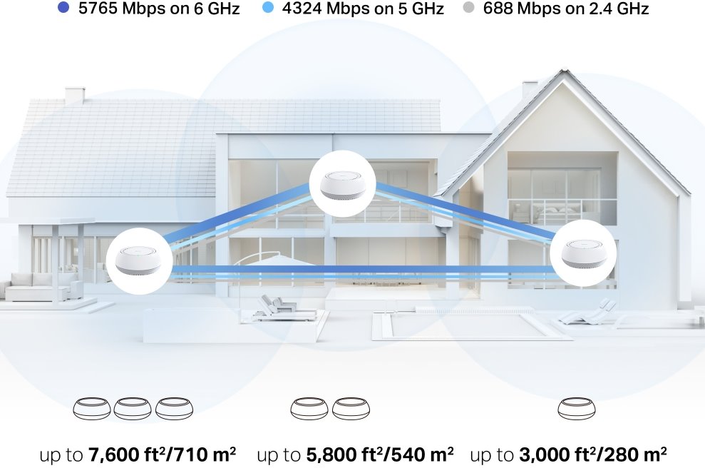 Zažijte síť nové generace s třípásmovou Wi-Fi 7 s 6 datovými streamy, rychlostí až 8647 Mb/s (6 GHz) + 4324 Mb/s (5 GHz) + 688 Mb/s (2.4 GHz) a šířkou pásma až 320 MHz. Díky možnosti montáže na strop, stěnu nebo položení na stůl se snadno přizpůsobí vašemu interiéru a zajistí optimální pokrytí.