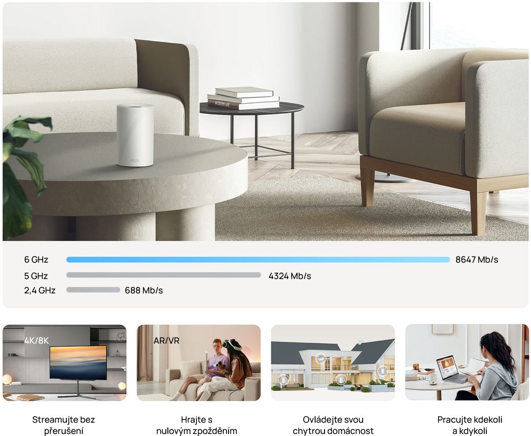 Moderní mesh systém posouvá domácí bezdrátovou síť na zcela novou úroveň díky technologii Wi-Fi 7. Třípásmová architektura s rychlostí 8647 Mb/s (6 GHz) + 4324 Mb/s (5 GHz) + 688 Mb/s (2.4 GHz) poskytuje plynulé streamování v 8K, online hraní bez odezvy i okamžité stahování velkých souborů. Využití pásma 6 GHz a 320MHz kanálů výrazně snižuje rušení a zajišťuje stabilní připojení i v hustě obsazených domácnostech plných chytrých zařízení.