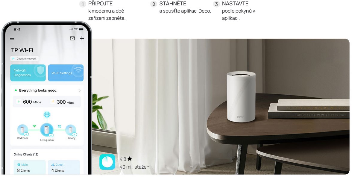 Pokročilé funkce jako Multi-Link Operation (MLO) umožňují současný přenos dat přes více pásem, čímž zvyšují rychlost, stabilitu a spolehlivost připojení. Inteligentní mesh technologie s AI-Roamingem eliminuje mrtvé zóny a zajišťuje nepřerušované připojení při pohybu po celé domácnosti. Ochranu sítě, zařízení i rodiny zajišťuje integrovaný HomeShield, zatímco univerzální kompatibilita umožňuje bezproblémové použití s jakýmkoli poskytovatelem internetu.
