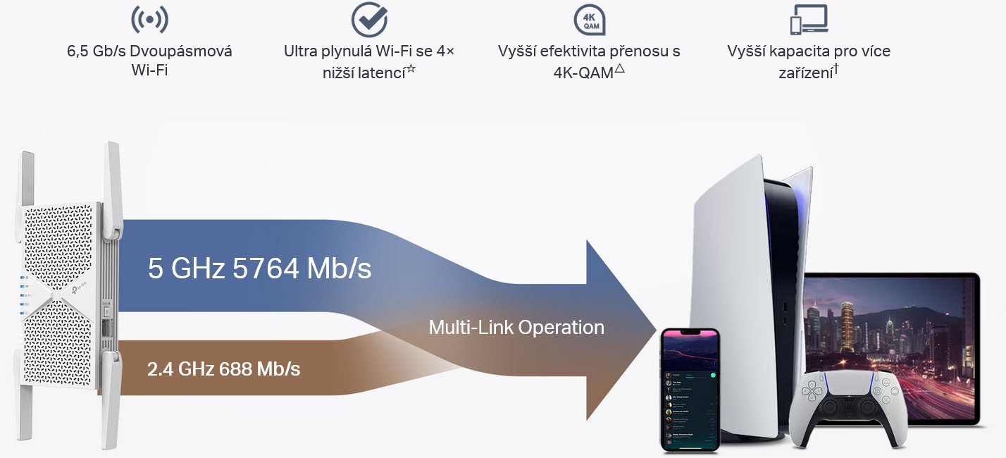 Zažijte maximální rychlost a spolehlivost s dvoupásmovou Wi-Fi 7 dosahující 5760 Mb/s na 5 GHz a 688 Mb/s na 2,4 GHz. Díky technologii Multi-Link Operation (MLO) se výrazně zvyšuje propustnost, snižuje latence a zlepšuje spolehlivost připojení, což je ideální pro online hry, streamování ve vysokém rozlišení nebo práci z domova. 2,5G Multi-Gigabitový Ethernet port poskytuje flexibilní možnosti připojení a zajišťuje rychlý přenos dat pro náročná zařízení.
