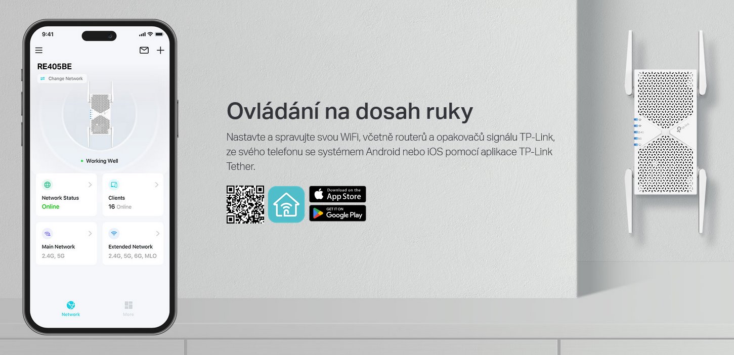 Nastavení je rychlé a pohodlné díky tlačítku WPS nebo intuitivní aplikaci Tether, která umožňuje upravit sílu signálu na tři úrovně podle potřeby. Zařízení nabízí skvělou kompatibilitu se všemi generacemi Wi-Fi, všemi poskytovateli internetu a všemi zařízeními. RE405BE je ideální volbou pro domácnosti i kanceláře, kde chcete zajistit spolehlivou, rychlou a pokrytou Wi-Fi síť bez mrtvých zón a výpadků připojení.