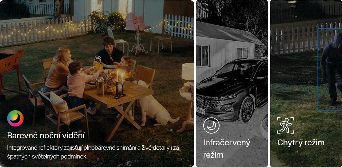 Tato kamera je odolná proti povětrnostním vlivům (IP65), takže ji můžete použít jak v interiéru, tak v exteriéru, ať už prší, nebo svítí slunce. S kompatibilitou s Alexou, Google Home a Samsung SmartThings můžete snadno ovládat kameru pomocí hlasových příkazů. Noční vidění s možností přepínání mezi barevným režimem, černobílým infračerveným režimem nebo inteligentním režimem podle světelných podmínek vám zajistí jasný přehled i v noci.