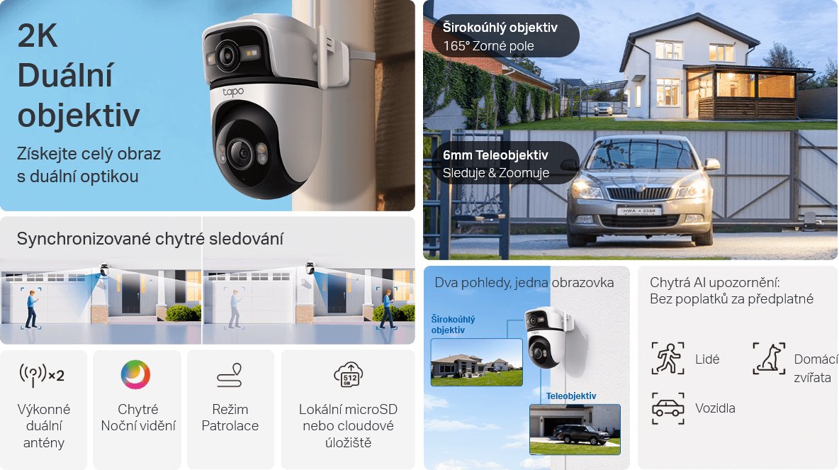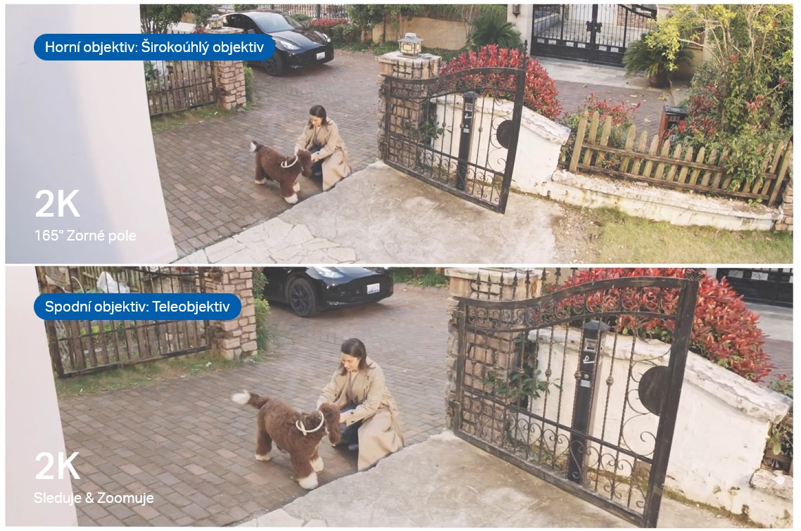 Získejte kompletní kontrolu nad svým prostorem díky dvojité 2K čočce, která umožňuje sledovat dvě nezávislé oblasti současně a minimalizuje mrtvé úhly. Kombinace širokoúhlé čočky s úhlem 165° a 6mm teleobjektivu poskytuje komplexní přehled i detailní přiblížení klíčových scén. Inteligentní systém pan/tilt otáčení navíc automaticky reaguje na detekovaný pohyb, takže vám nikdy nic neunikne. Ideální řešení pro domy, vchody, dvory i parkoviště.