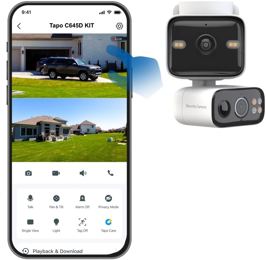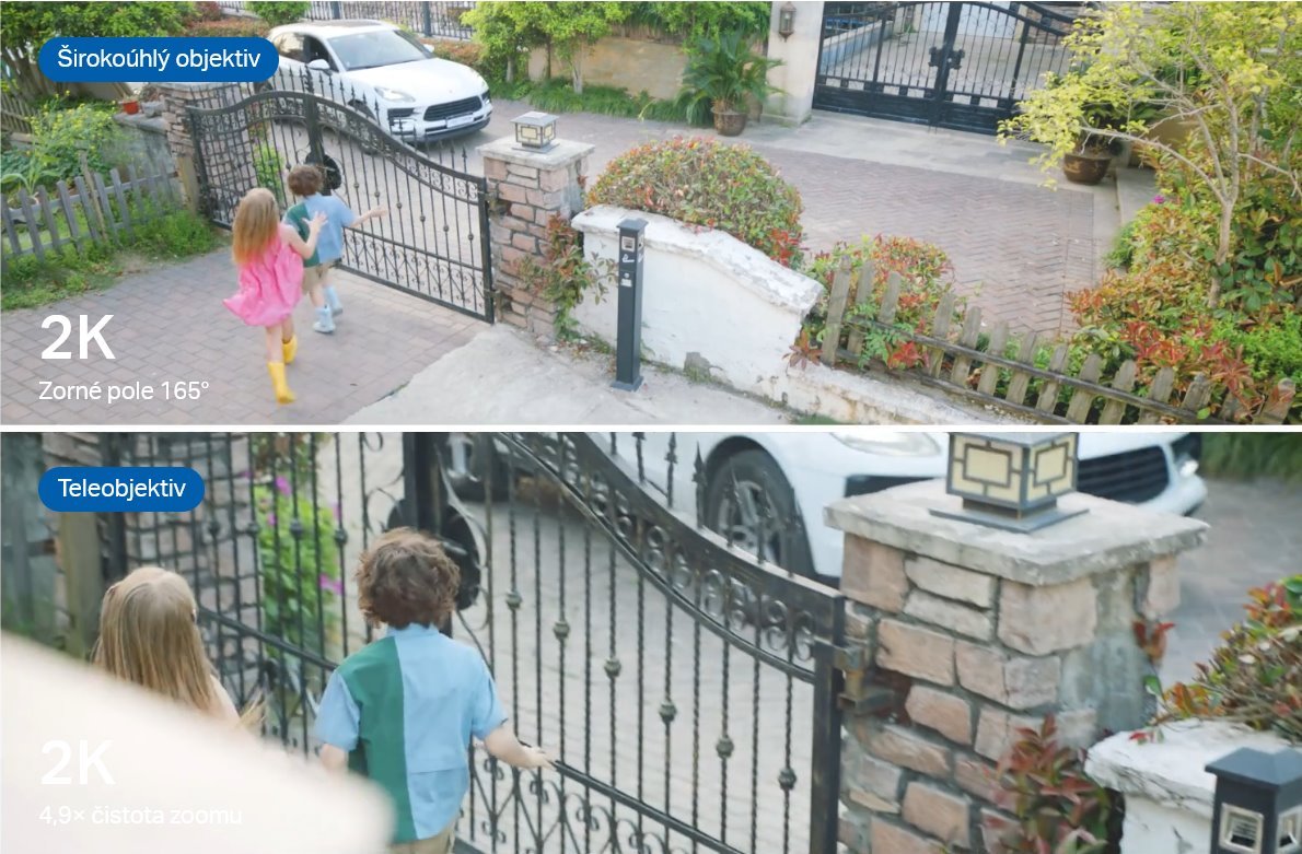 Bezpečnostní kamera s uniktní kombinací dvou objektivů umožňuje sledovat dvě oblasti současně bez slepých míst. Pevný ultraširokoúhlý 2K objektiv s rozlišením 3 Mpx (2304 x 1296 px) nepřetržitě hlídá scénu, zatímco druhý 2K teleobjektiv s funkcí Pan/Tilt se otáčí a naklání pro detailní kontrolu vybraných míst. Nezávislé ovládání obou objektivů přináší přesné a flexibilní monitorování okolí domu.