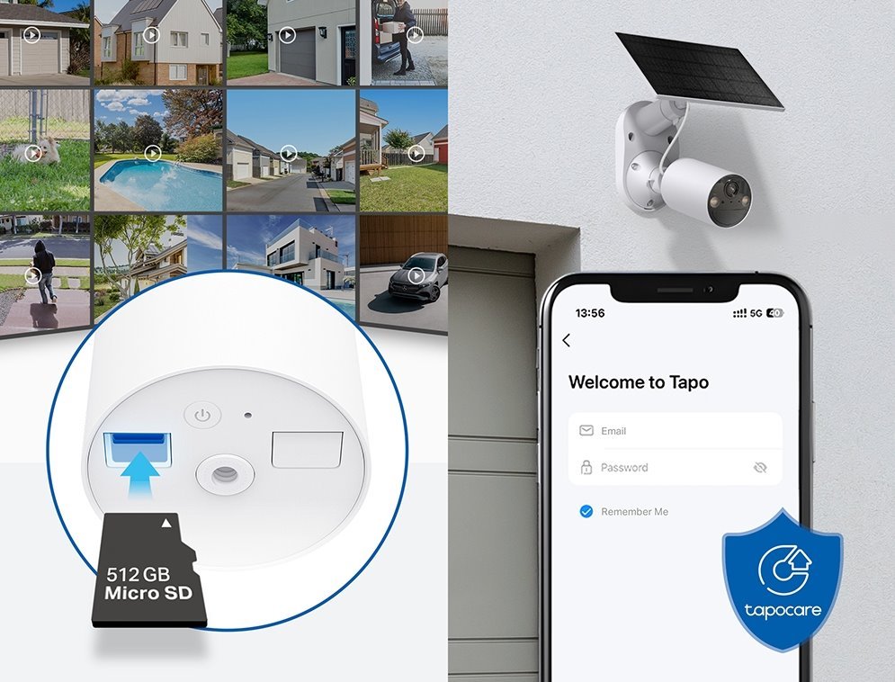 Můžete spustit zvukový a světelný alarm, abyste zahnali nechtěné návštěvníky. Kameru můžete umístit také venku (krytí IP65). Zaznamenaná videa můžete ukládat na microSD kartu (až 512 GB) vloženou do slotu v kameře nebo do cloudového úložiště v rámci služby Tapo Care.