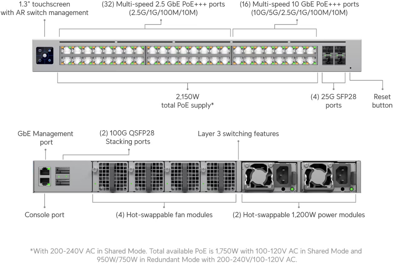 Špičkový 48portový L3 switch s podporou PoE+++ je navržen pro moderní infrastruktury, které vyžadují vysokou propustnost, spolehlivost a pokročilé síťové funkce. Nabízí kombinaci 16× 2,5G a 32× 10G RJ-45 portů s napájením PoE+++, doplněnou o 2× 100G QSFP28 a 4× 25G SFP28 pro ultrarychlé uplinky. Celkový PoE výkon až 2150 W ve sdíleném režimu zajišťuje dostatek energie pro rozsáhlé nasazení IP kamer, AP nebo dalších zařízení.