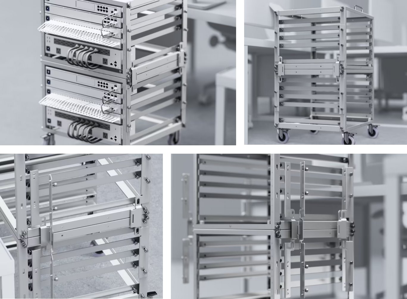 Miniaturní stojanový montážní rám na kolečkách o velikosti 6U , hloubkou 460 mm a speciálním typem bezšroubkového uchycení jednotlivých aktivních i pasivních prvků je kompatibilní s většinou Ubiquiti