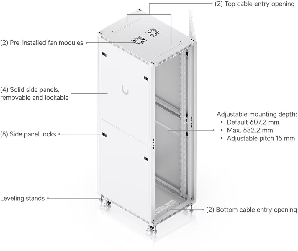 Instalaci technologií různé hloubky umožňuje nastavitelná montážní hloubka 607,2–682,2 mm, přičemž statická nosnost až 800 kg poskytuje dostatečnou rezervu i pro velmi těžké osazení. Stabilní provoz podporuje vestavěný ventilátor pro aktivní chlazení a promyšlené kabelové průchody pro organizované vedení kabeláže. Snadnou manipulaci zajišťují kolečka se zajištěním, pevné usazení pak vyrovnávací patky. Ochranu technologie garantuje komplexní uzamykací systém dveří a bočních panelů, který splňuje požadavky na bezpečný provoz kritické infrastruktury.