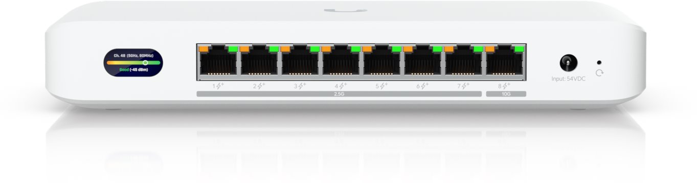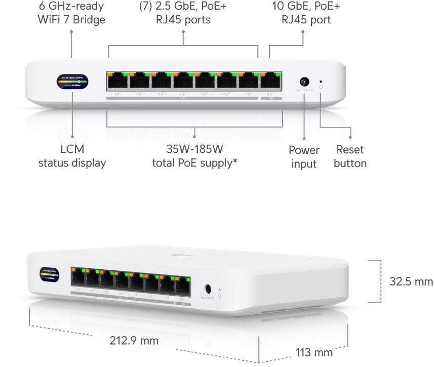 Pro připojení koncových zařízení nabízí switch jeden 10GbE uplink a sedm 2,5GbE portů, což umožňuje flexibilní a vysokorychlostní vnitřní infrastrukturu. Všech osm portů podporuje PoE+ s výkonem až 30 W na port. V základní konfiguraci poskytuje 35 W celkového PoE výkonu, který lze s volitelným 210W adaptérem navýšit až na 185 W—ideální pro napájení náročnějších zařízení, jako jsou kamery, senzory nebo přístupové body. Díky plné podpoře VLAN a správě přes UniFi Network získává uživatel přehlednou kontrolu nad celou sítí.